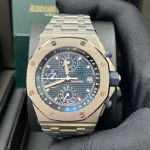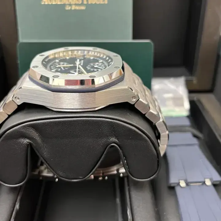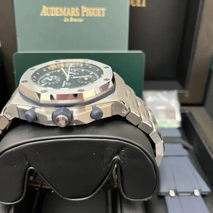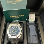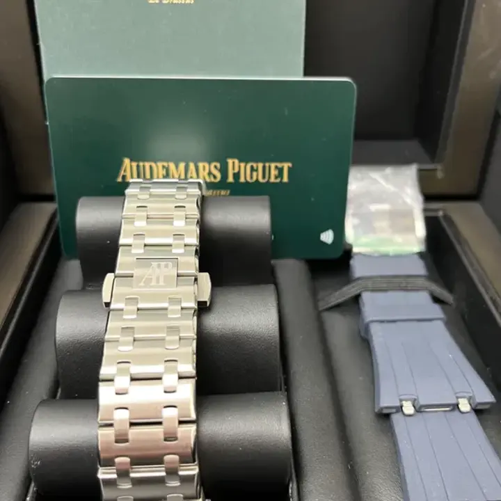 Blue dial with “Petite Tapisserie” pattern, blue counters, white gold applied hour-markers and Royal Oak hands with luminescent coating, blue inner bezel.