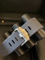 Blue rubber strap with titanium  pin buckle and interchangeable strap system. Additional black rubber strap