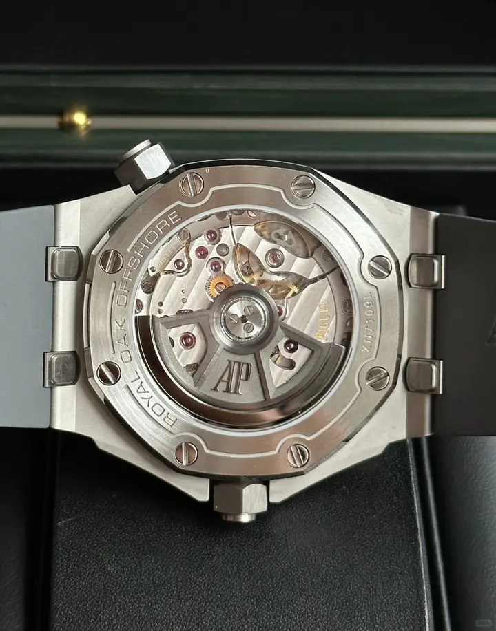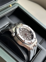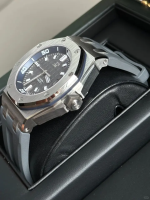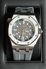 Grey dial with “Méga Tapisserie” pattern, white gold applied hour-markers and Royal Oak hands with luminescent coating, blue rotating inner bezel with zone from 60 to 15 minutes in white
