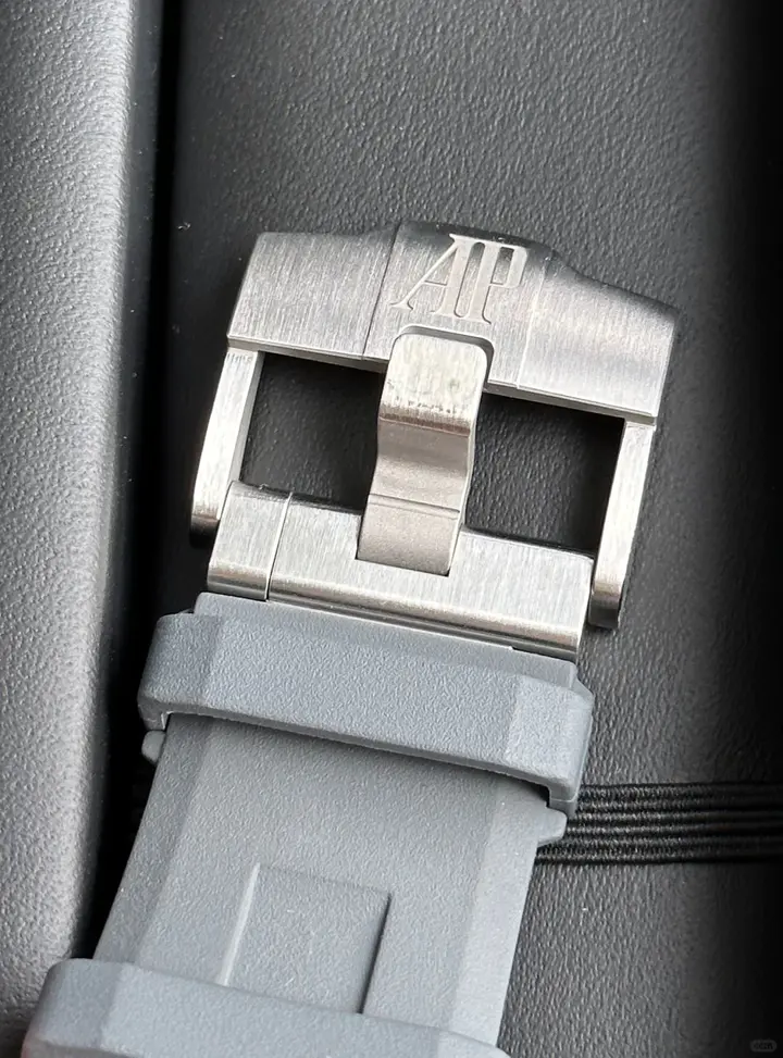 Grey rubber strap with stainless steel pin buckle and interchangeable strap system.