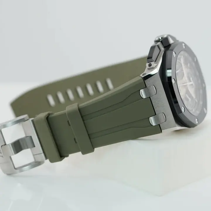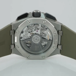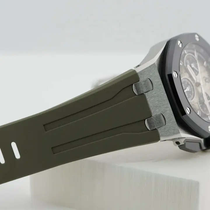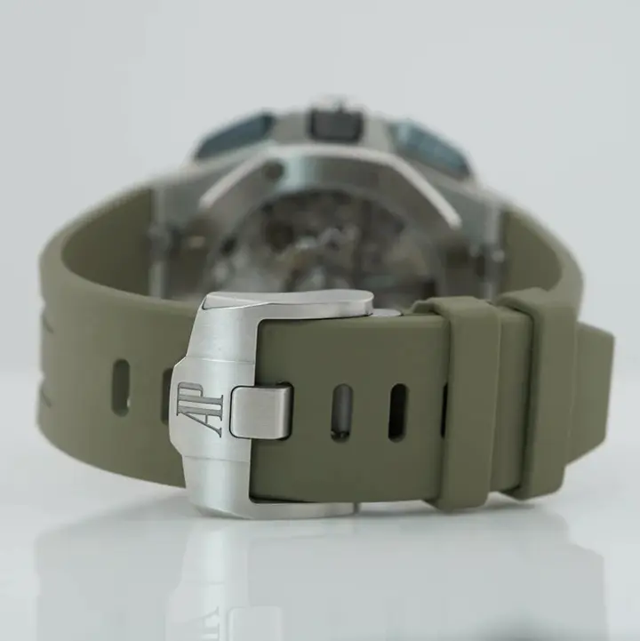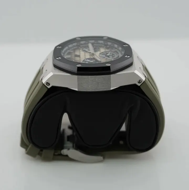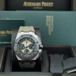 Smoked light brown dial with “Méga Tapisserie” pattern, black counters and external zone, white gold applied hour-markers, white gold Royal Oak hands with luminescent coating, black inner bezel