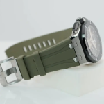 Light brown rubber strap with stainless steel pin buckle and interchangeable strap system. Additional black rubber strap